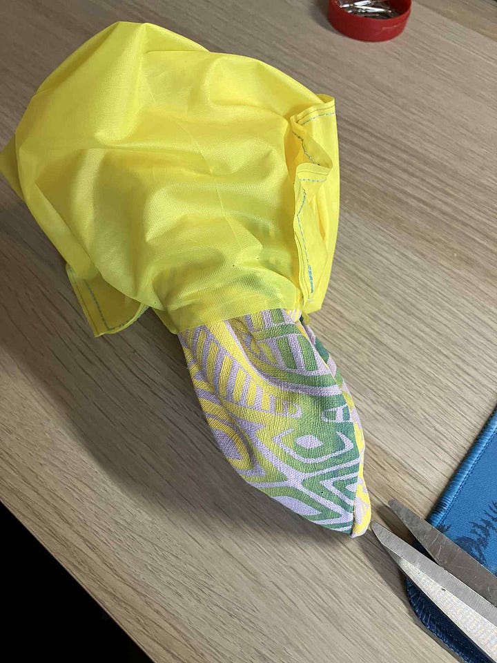Get a ruler and stick it through the gap in the lining, running it along the corners and edges, in order to completely turn the sleeve the right side around and smooth it all out.