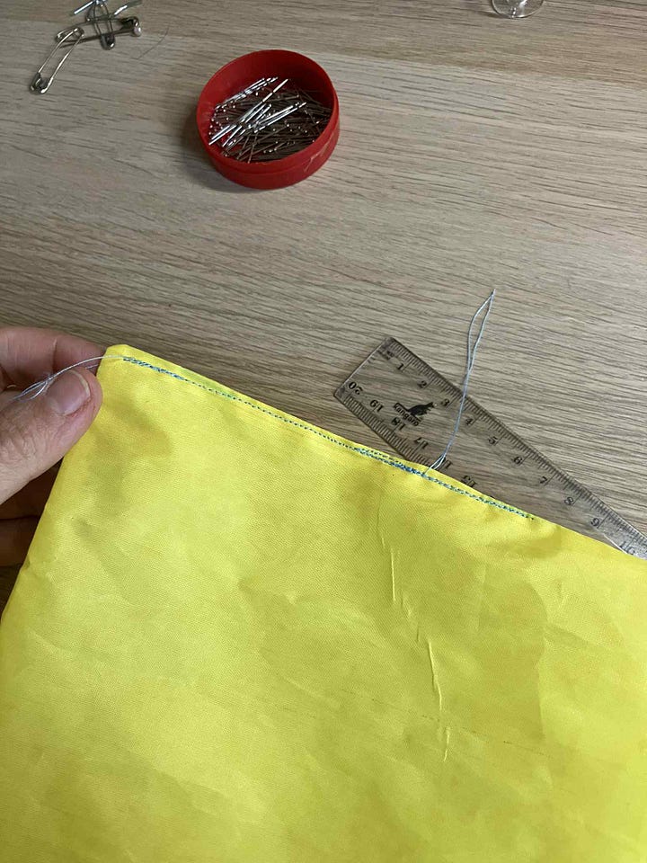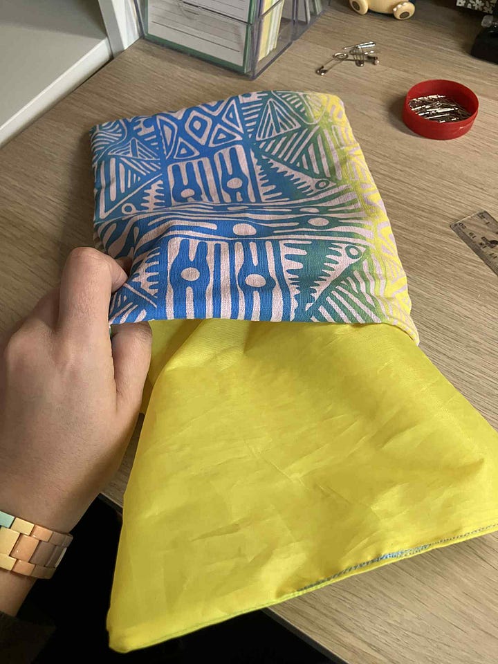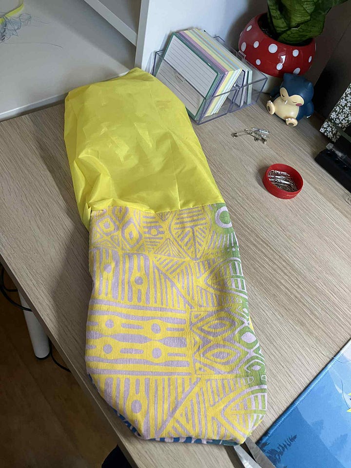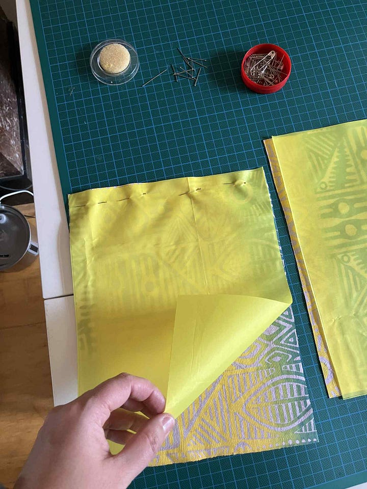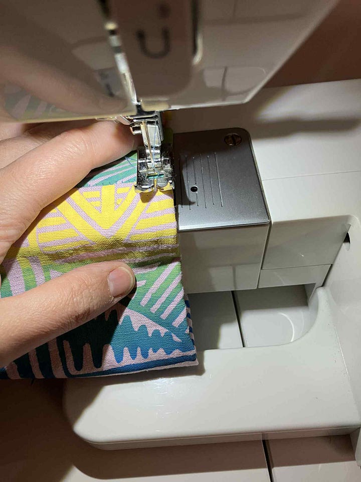 (If your fabrics have a pattern with a top and a bottom, the pinned part you’re about to sew is where the top part should be. So let’s say, you’re using a pattern with a print of Pedro Pascal in it, his hair should be pointed to there you’re about to sew - unless you prefer him upside down, that’s your kink to deal with and none of my beeswax.)