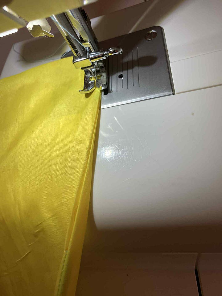 Continue to sew, making sure that the middle parts, which is the first thing you have sewn, where the lining and the outside fabric overlap, isn’t folded weirdly, the sewing machine should go over it smoothly. See image below.