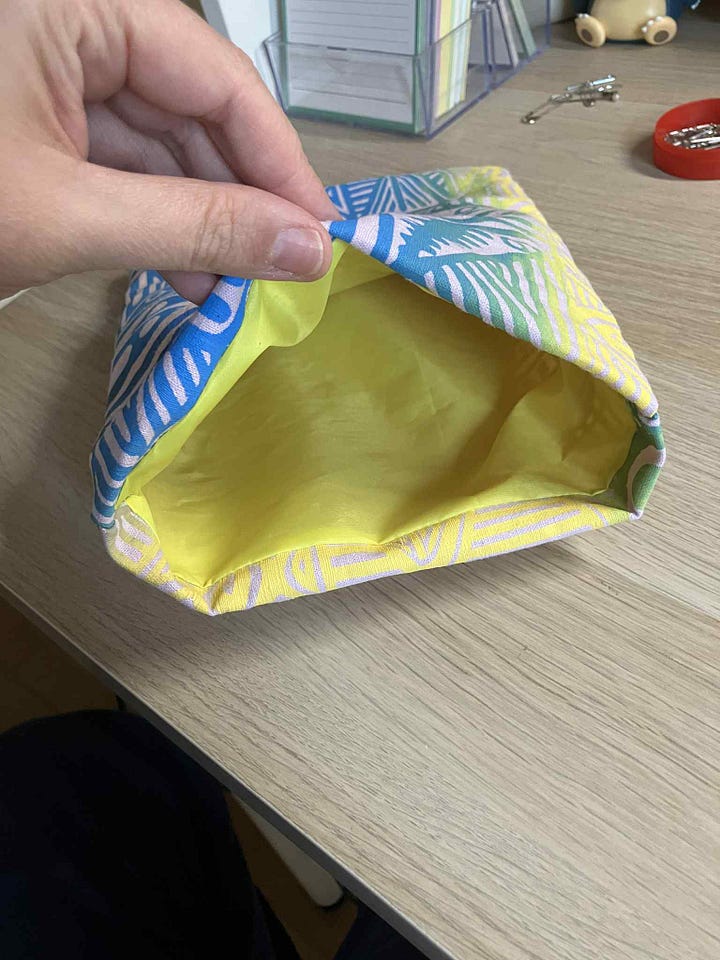You’re going to use this gap to turn the fabric the right side in. But before you do that, remove the pins you used to keep the fabrics together, round the corners with some scissors, eventually cut off some extra unalined fabric if necessary, making sure you don’t cut through any of the stitches.