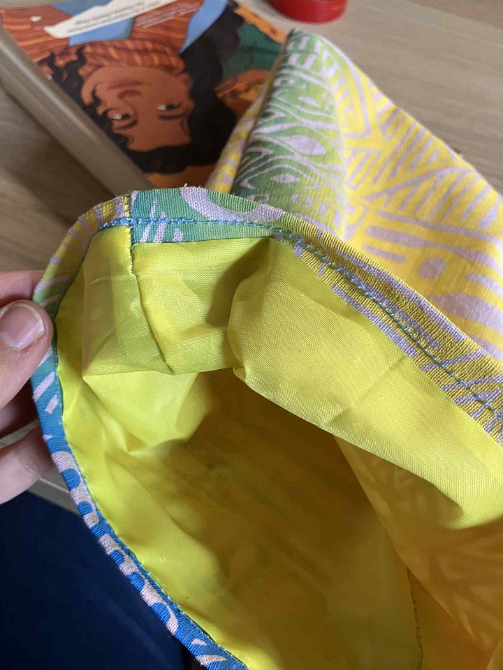 Now, this next step can be tricky: you have to make sure that you fold a bit of the lining towards the inside of the gap, in order to be able to sew the two pieces of fabric together neatly. See image below.
